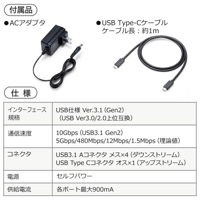 Usb Type Cハブ 4ポート Usb3 1 Gen2 セルフパワー ブラック 400 Hub061の販売商品 通販ならサンワダイレクト