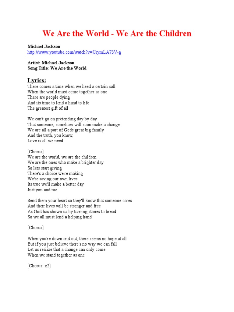 Lyrics Michael Jackson We Are The World Youtube