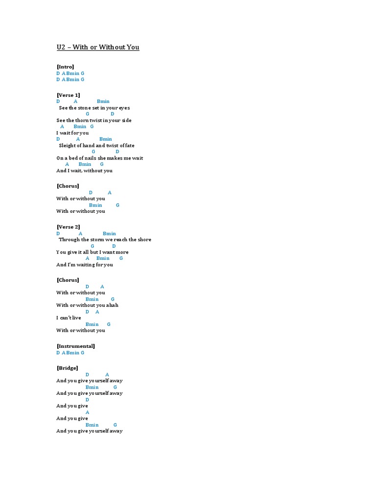 U2 With Or Without You Song Sheet Song Structure Musical Forms